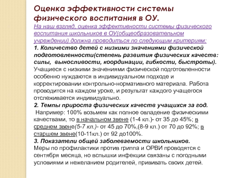 эффективности системы физического воспитания школьников в ОУ(общеобразовательном учреждении) должна проводиться по следующим критериям: