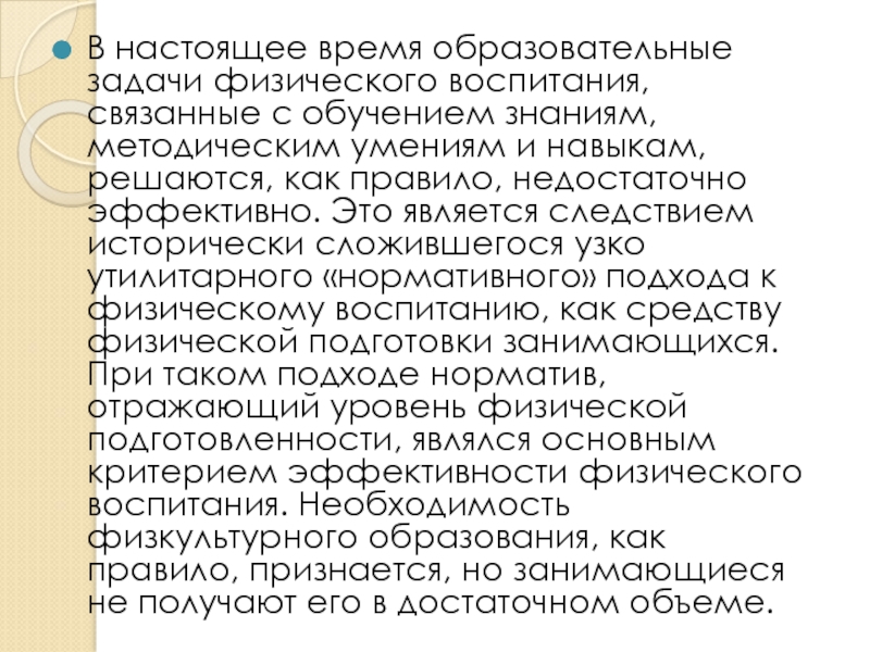 методическим умениям и навыкам, решаются, как правило, недостаточно эффективно. Это является следствием исторически сложившегося узко утилитарного «нормативного» подхода к физическому воспитанию, как средству физической подготовки занимающихся. При таком подходе норматив, отражающий уровень физической подготовленности, являлся основным критерием эффективности физического воспитания. Необходимость физкультурного образования, как правило, признается, но занимающиеся не получают его в достаточном объеме.