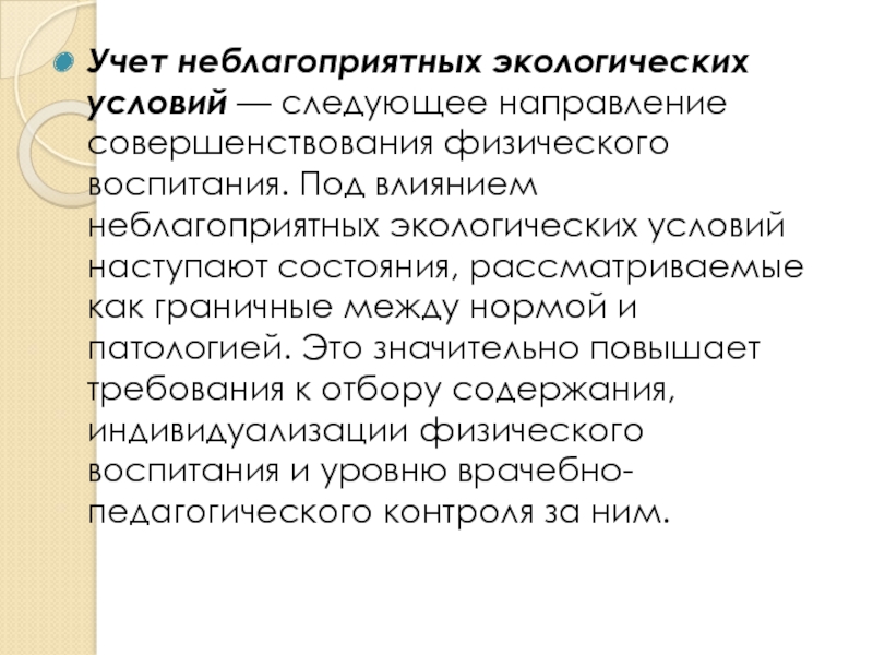 Слайд 25Учет неблагоприятных экологических условий — следующее направление совершенствования физического воспитания. Под