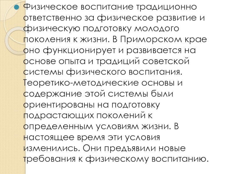 поколения к жизни. В Приморском крае оно функционирует и развивается на основе опыта и традиций советской системы физического воспитания. Теоретико-методические основы и содержание этой системы были ориентированы на подготовку подрастающих поколений к определенным условиям жизни. В настоящее время эти условия изменились. Они предъявили новые требования к физическому воспитанию.