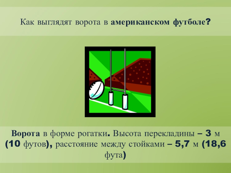 Как выглядят ворота в американском футболе?Ворота в форме рогатки. Высота перекладины – 3 м (10 футов), расстояние