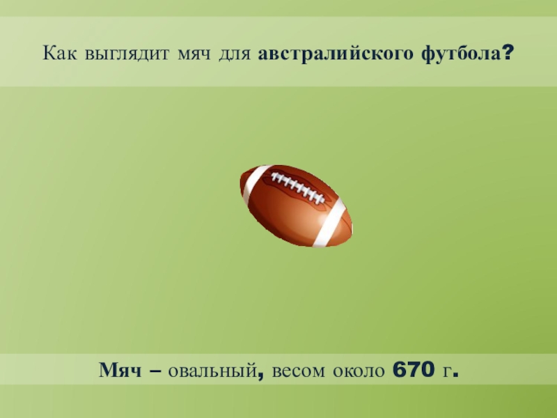 Как выглядит мяч для австралийского футбола?Мяч – овальный, весом около 670 г.