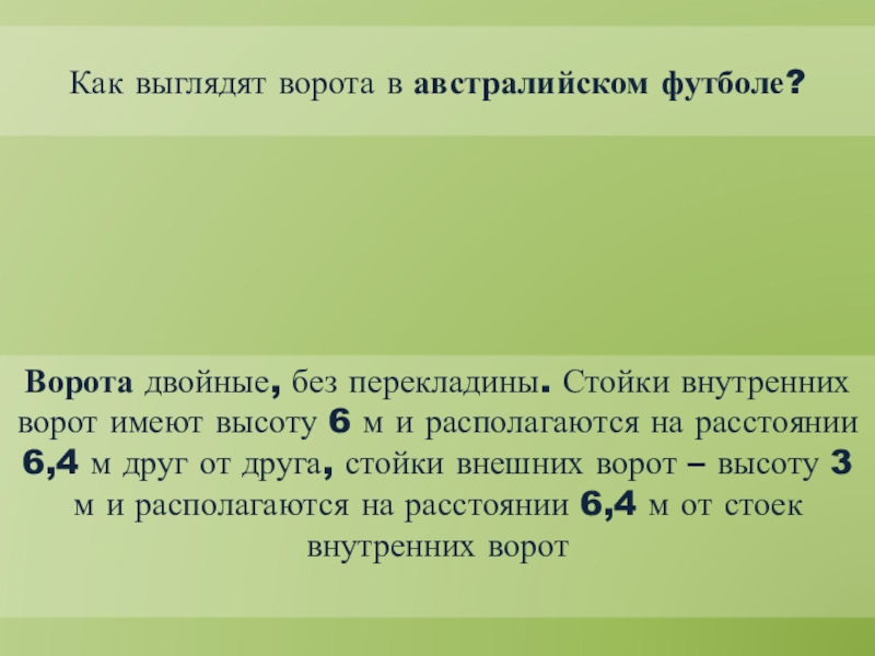 Как выглядят ворота в австралийском футболе?Ворота двойные, без перекладины. Стойки внутренних ворот имеют высоту 6 м и
