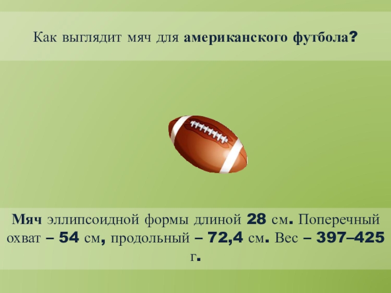 Как выглядит мяч для американского футбола?Мяч эллипсоидной формы длиной 28 см. Поперечный охват – 54 см, продольный – 72,4 см. Вес – 397–425 г.