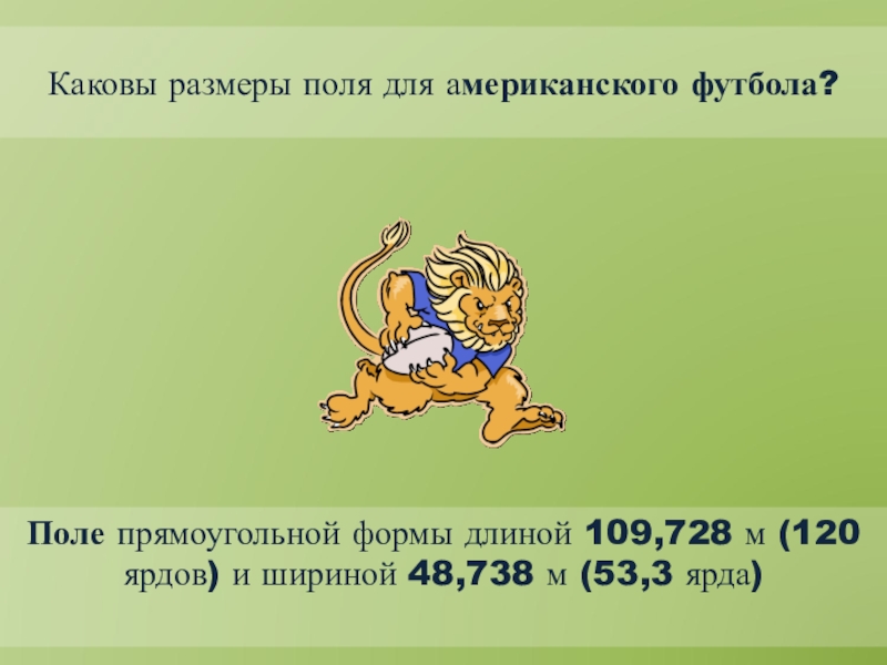 Каковы размеры поля для американского футбола?Поле прямоугольной формы длиной 109,728 м (120 ярдов) и шириной 48,738 м