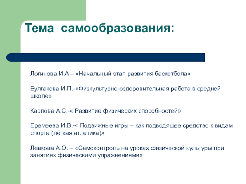 Тема самообразования: Логинова И.А – «Начальный этап развития баскетбола»Булгакова И.П.-«Физкультурно-оздоровительная работа в средней школе»Карпова А.С.-« Развитие физических