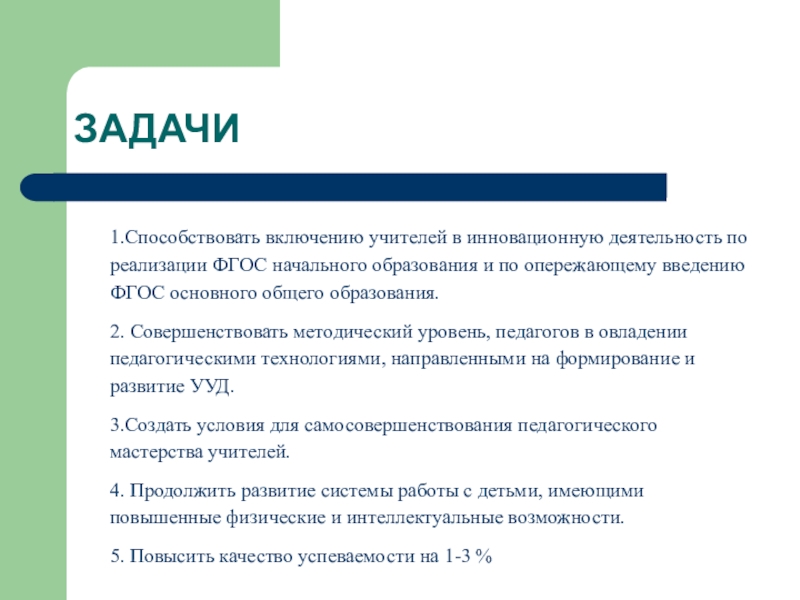ЗАДАЧИ1.Способствовать включению учителей в инновационную деятельность по реализации ФГОС начального образования и по опережающему введению ФГОС основного