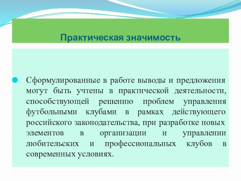 практической деятельности, способствующей решению проблем управления футбольными клубами в рамках действующего российского законодательства, при разработке новых элементов в организации и управлении любительских и профессиональных клубов в современных условиях.