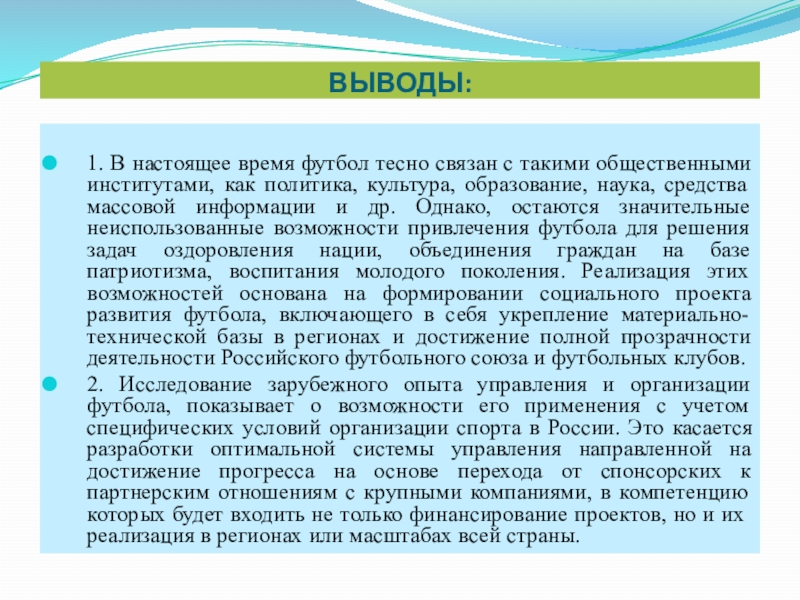 2. Исследование зарубежного опыта управления и организации футбола, показывает о возможности его применения с учетом специфических условий организации спорта в России. Это касается разработки оптимальной системы управления направленной на достижение прогресса на основе перехода от спонсорских к партнерским отношениям с крупными компаниями, в компетенцию которых будет входить не только финансирование проектов, но и их реализация в регионах или масштабах всей страны.