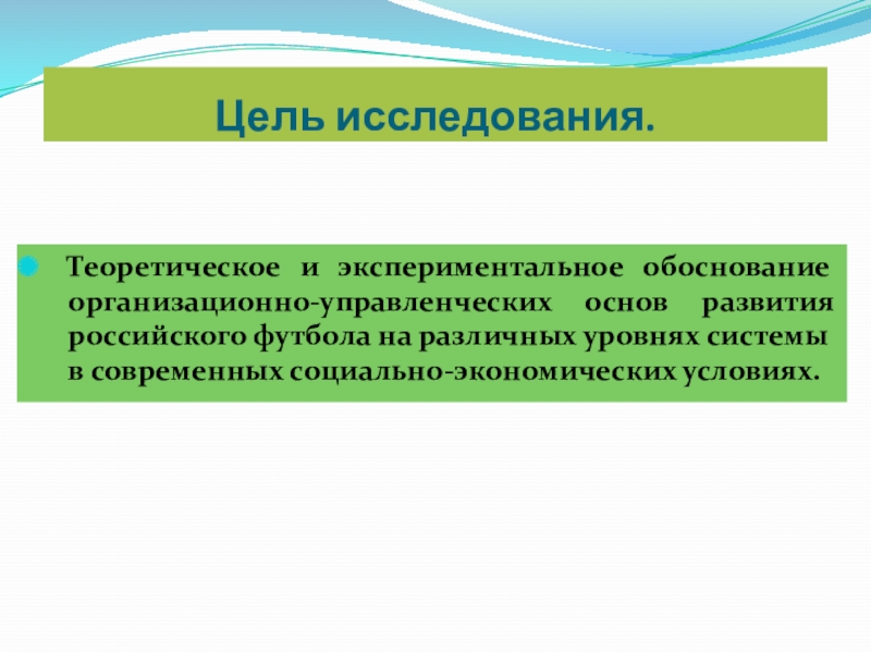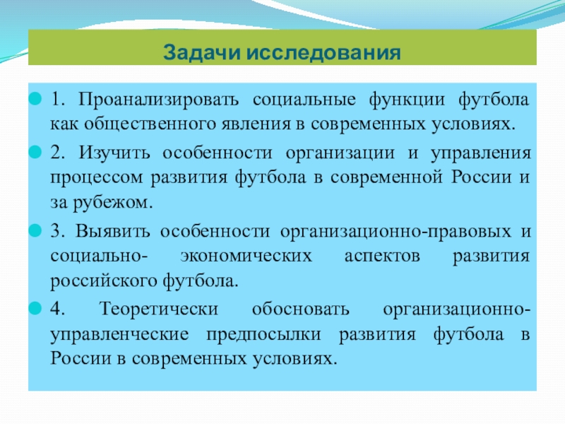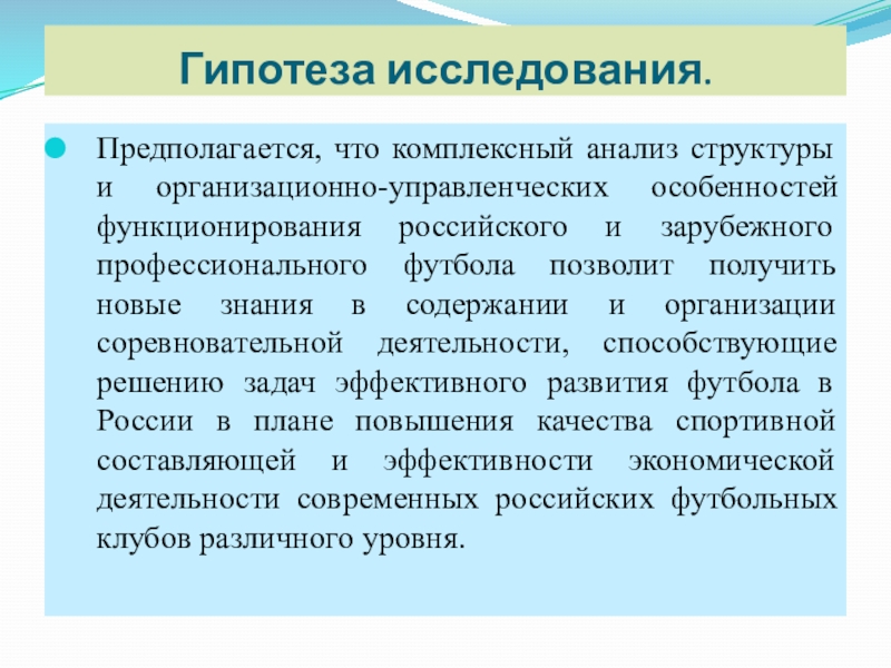 Предмет исследования. Система управления процессом развития российского футбола и совершенствование его организации в современных условиях.