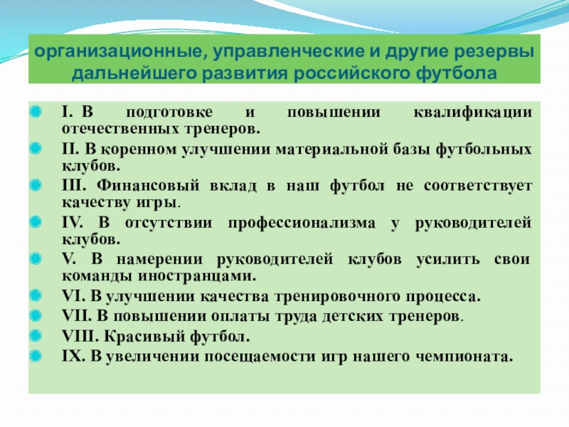 Слайд 9организационные, управленческие и другие резервы дальнейшего развития российского футбола