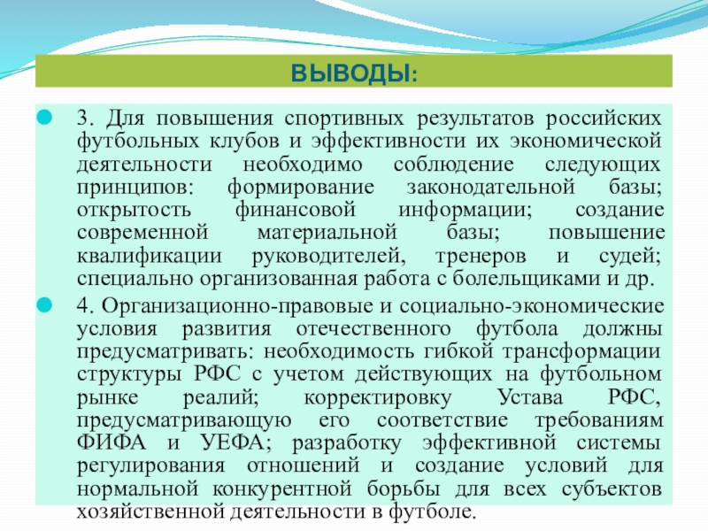 4. Организационно-правовые и социально-экономические условия развития отечественного футбола должны предусматривать: необходимость гибкой трансформации структуры РФС с учетом действующих на футбольном рынке реалий; корректировку Устава РФС, предусматривающую его соответствие требованиям ФИФА и УЕФА; разработку эффективной системы регулирования отношений и создание условий для нормальной конкурентной борьбы для всех субъектов хозяйственной деятельности в футболе.