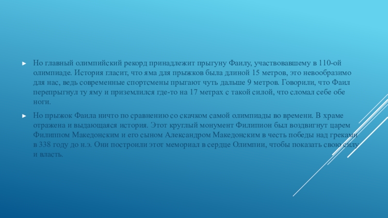 Слайд 33Но главный олимпийский рекорд принадлежит прыгуну Фаилу, участвовавшему в 110-ой олимпиаде.