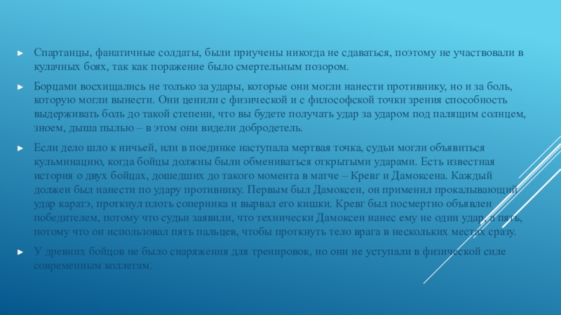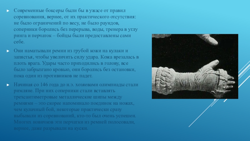Слайд 9Современные боксеры были бы в ужасе от правил соревнования, вернее, от