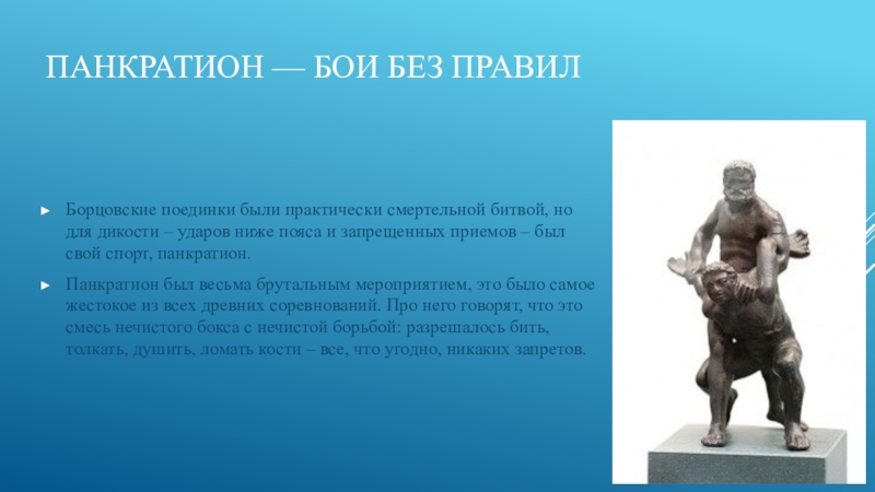 для дикости – ударов ниже пояса и запрещенных приемов – был свой спорт, панкратион.