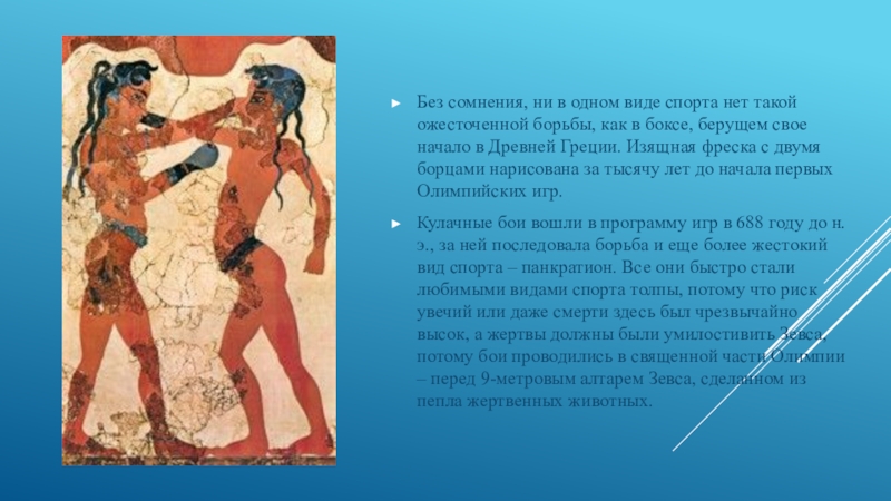 как в боксе, берущем свое начало в Древней Греции. Изящная фреска с двумя борцами нарисована за тысячу лет до начала первых Олимпийских игр.