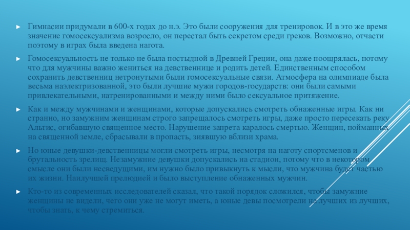 тренировок. И в это же время значение гомосексуализма возросло, он перестал быть секретом среди греков. Возможно, отчасти поэтому в играх была введена нагота.