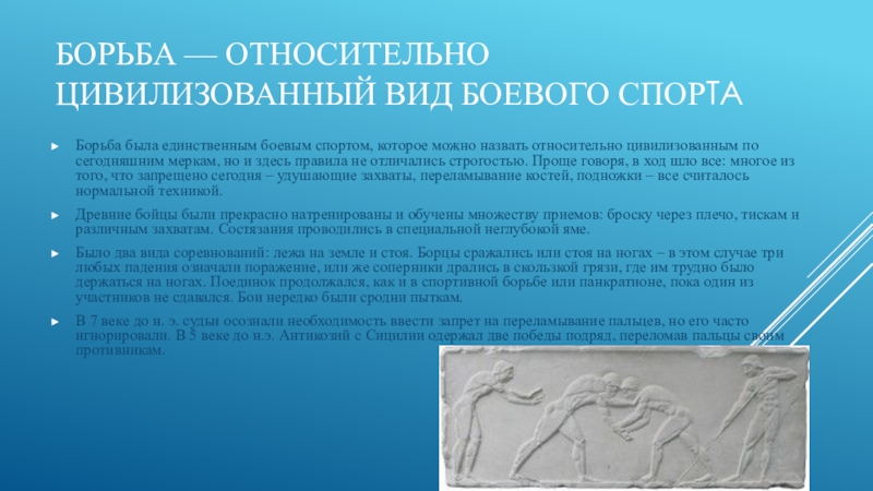 Слайд 15Борьба — относительно цивилизованный вид боевого спорта
