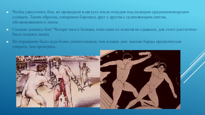 Сколько длились бои? Четыре часа и больше, пока один из атлетов не сдавался, для этого достаточно было поднять палец.