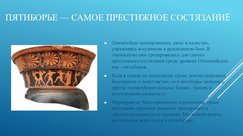 Если в гонках на колесницах греки демонстрировали бесстрашие и неистовство, то в пятиборье ценились другие олимпийские идеалы: баланс, грация и всесторонняя развитость.