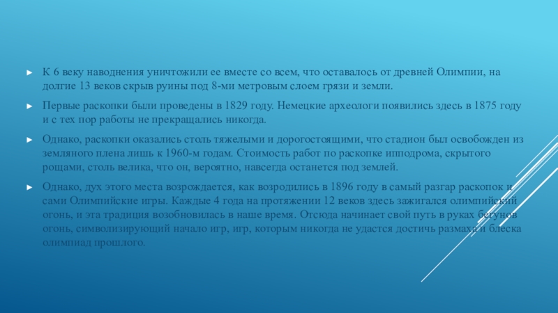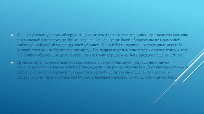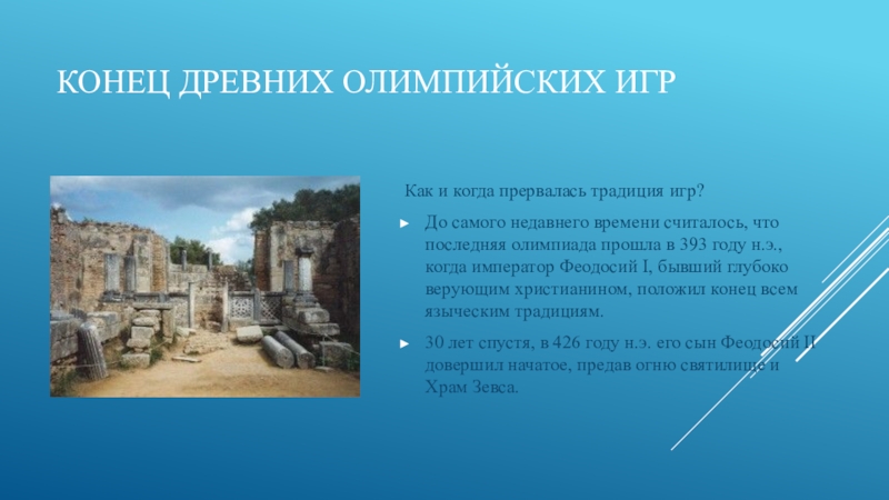 времени считалось, что последняя олимпиада прошла в 393 году н.э., когда император Феодосий I, бывший глубоко верующим христианином, положил конец всем языческим традициям.