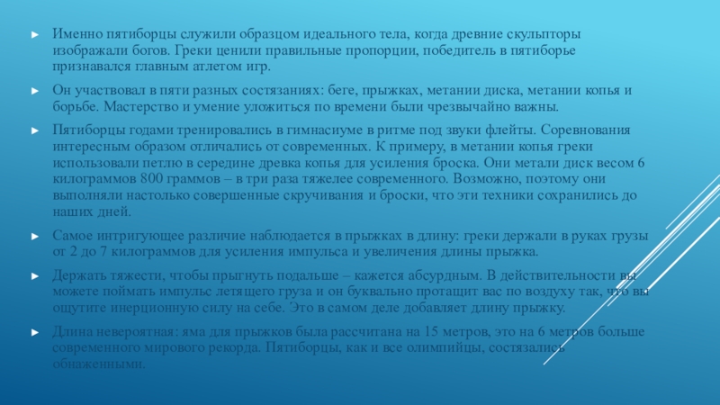 Слайд 21Именно пятиборцы служили образцом идеального тела, когда древние скульпторы изображали богов.