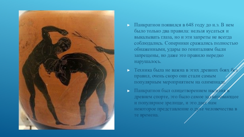 Слайд 14Панкратион появился в 648 году до н.э. В нем было только