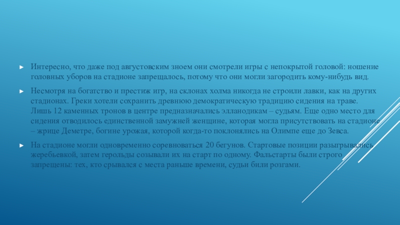 Несмотря на богатство и престиж игр, на склонах холма никогда не строили лавки, как на других стадионах. Греки хотели сохранить древнюю демократическую традицию сидения на траве. Лишь 12 каменных тронов в центре предназначались элланодикам – судьям. Еще одно место для сидения отводилось единственной замужней женщине, которая могла присутствовать на стадионе – жрице Деметре, богине урожая, которой когда-то поклонялись на Олимпе еще до Зевса.