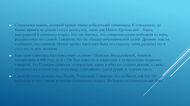 Среди бегунов лучшим был Леонид Родосский. Говорили, что он быстр, как бог. Он побеждал в трех гонках в течение 4 олимпиад подряд. На Родосе его почитали как бога.