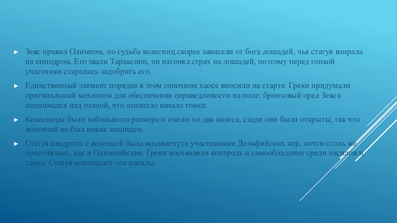 Слайд 18Зевс правил Олимпом, но судьба колесниц скорее зависели от бога лошадей,