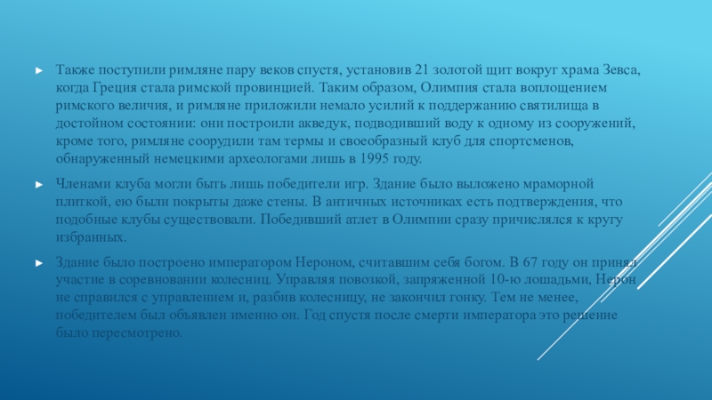 храма Зевса, когда Греция стала римской провинцией. Таким образом, Олимпия стала воплощением римского величия, и римляне приложили немало усилий к поддержанию святилища в достойном состоянии: они построили акведук, подводивший воду к одному из сооружений, кроме того, римляне соорудили там термы и своеобразный клуб для спортсменов, обнаруженный немецкими археологами лишь в 1995 году.