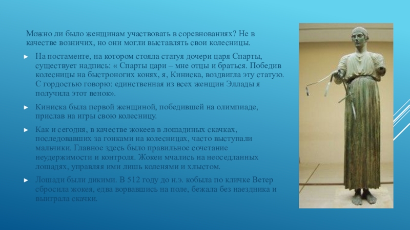 Слайд 19Можно ли было женщинам участвовать в соревнованиях? Не в качестве возничих,