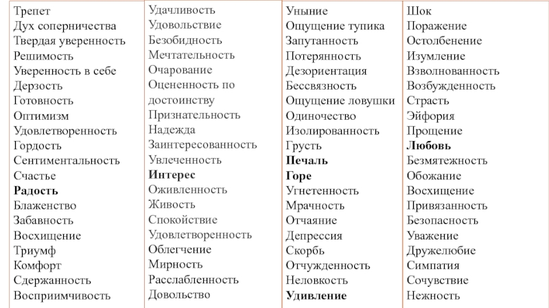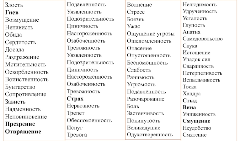 ЗлостьГневВозмущениеНенавистьОбидаСердитостьДосадаРаздражениеМстительностьОскорбленностьВоинственностьБунтарствоСопротивлениеЗавистьНадменностьНеповиновениеПрезрениеОтвращениеПодавленностьУязвленностьПодозрительностьЦиничностьНастороженностьОзабоченностьТревожностьУязвленностьПодозрительностьЦиничностьНастороженностьОзабоченностьТревожностьСтрахНервозностьТрепетОбеспокоенностьИспугТревогаВолнениеСтрессБоязньУжасОщущение угрозыОшеломленностьОпасениеОпустошенностьБеспомощностьСлабостьРанимостьУгрюмостьПодавленностьРазочарованиеБольЗастенчивостьПокинутостьВеликодушиеОдухотворенностьНелюдимостьУдрученностьУсталостьГлупостьАпатияСамодовольствоСкукаИстощениеУпадок силСварливостьНетерпеливостьВспыльчивостьТоскаХандраСтыдВинаУниженностьСмущениеНеудобствоСмятение