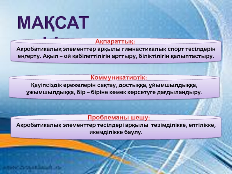 Акробатикалық элементтер тәсілдері арқылы төзімділікке, ептілікке, икемділікке баулу.