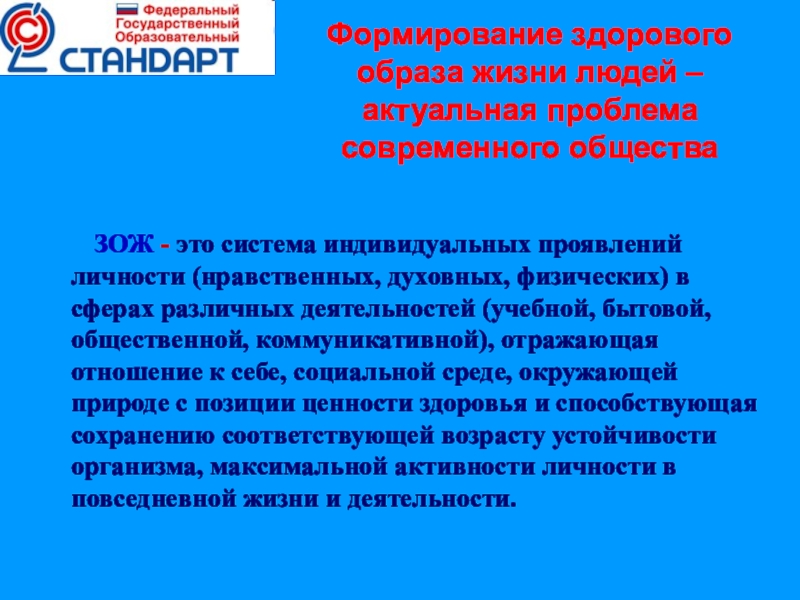 ЗОЖ - это система индивидуальных проявлений личности (нравственных, духовных, физических) в сферах различных деятельностей (учебной, бытовой, общественной, коммуникативной), отражающая отношение к себе, социальной среде, окружающей природе с позиции ценности здоровья и способствующая сохранению соответствующей возрасту устойчивости организма, максимальной активности личности в повседневной жизни и деятельности.