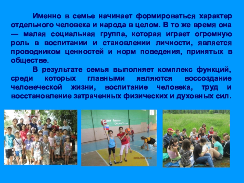 целом. В то же время она — малая социальная группа, которая играет огромную роль в воспитании и становлении личности, является проводником ценностей и норм поведения, принятых в обществе.