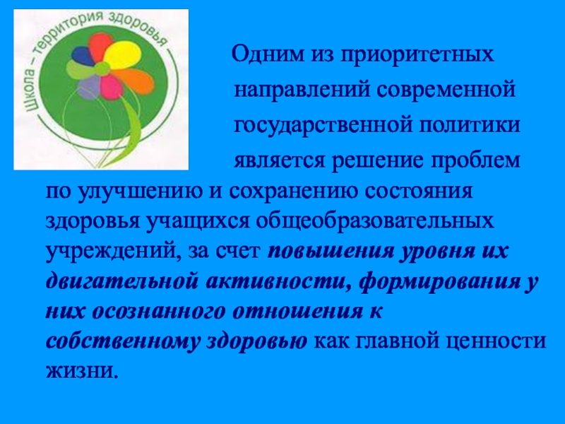 является решение проблем по улучшению и сохранению состояния здоровья учащихся общеобразовательных учреждений, за счет повышения уровня их двигательной активности, формирования у них осознанного отношения к собственному здоровью как главной ценности жизни.