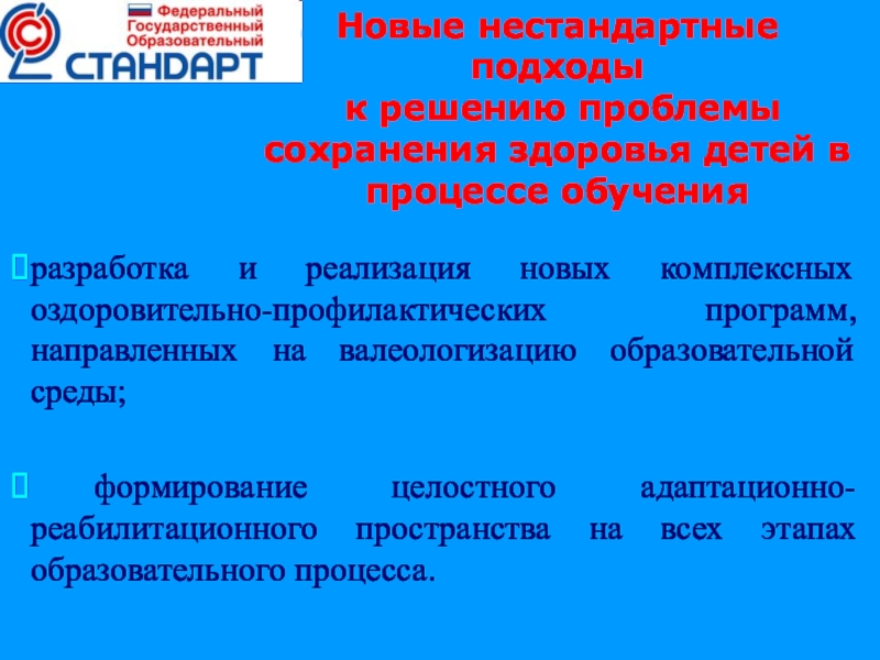 разработка и реализация новых комплексных оздоровительно-профилактических программ, направленных на валеологизацию образовательной среды;