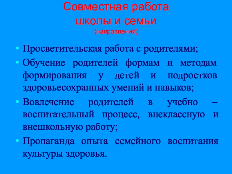 формированию культуры здоровья школьников в совместной деятельности школы и семьи