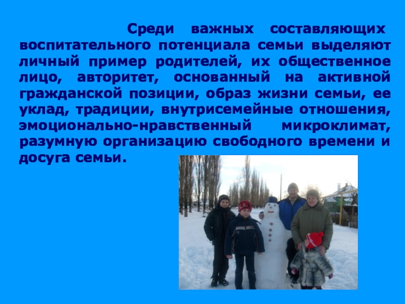 семьи выделяют личный пример родителей, их общественное лицо, авторитет, основанный на активной гражданской позиции, образ жизни семьи, ее уклад, традиции, внутрисемейные отношения, эмоционально-нравственный микроклимат, разумную организацию свободного времени и досуга семьи.