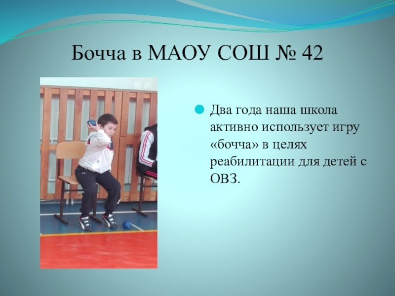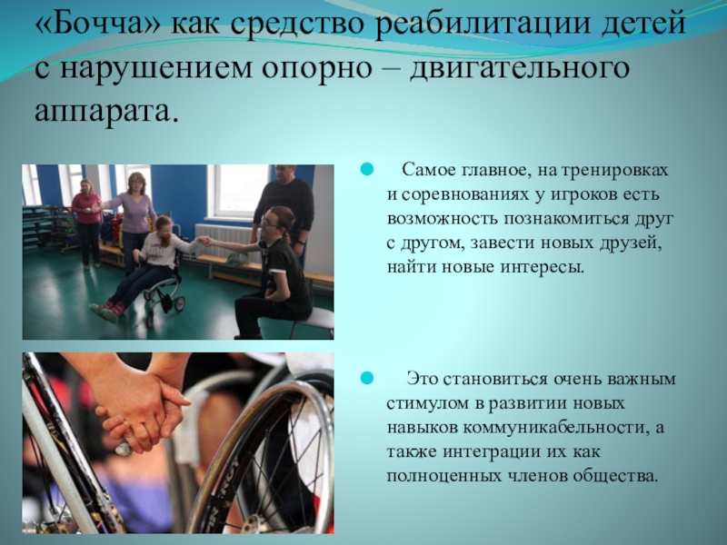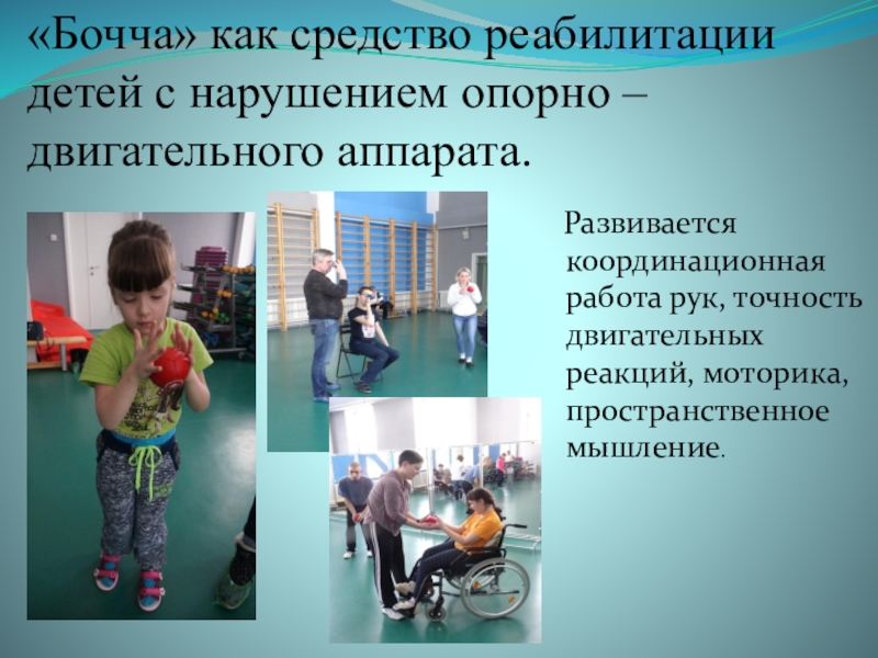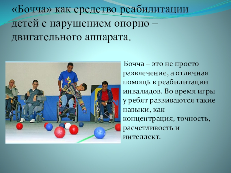Слайд 7«Бочча» как средство реабилитации детей с нарушением опорно – двигательного аппарата.