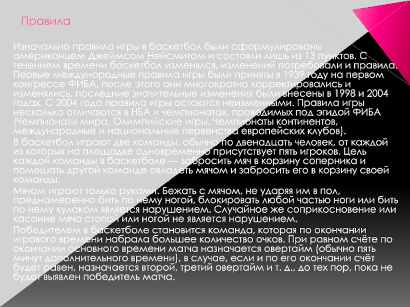 из 13 пунктов. С течением времени баскетбол изменялся, изменений потребовали и правила. Первые международные правила игры были приняты в 1939 году на первом конгрессе ФИБА, после этого они многократно корректировались и изменялись, последние значительные изменения были внесены в 1998 и 2004 годах. С 2004 года правила игры остаются неизменными. Правила игры несколько отличаются в НБА и чемпионатах, проводимых под эгидой ФИБА (Чемпионаты мира, Олимпийские игры, Чемпионаты континентов, международные и национальные первенства европейских клубов).