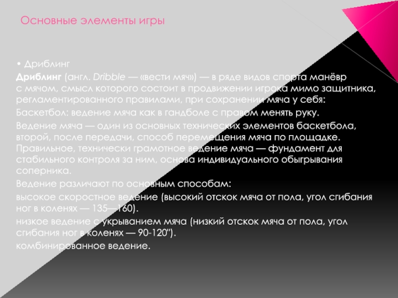 высокое скоростное ведение (высокий отскок мяча от пола, угол сгибания ног в коленях — 135—160).
