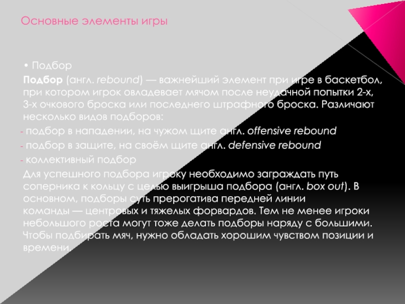 котором игрок овладевает мячом после неудачной попытки 2-х, 3-х очкового броска или последнего штрафного броска. Различают несколько видов подборов: