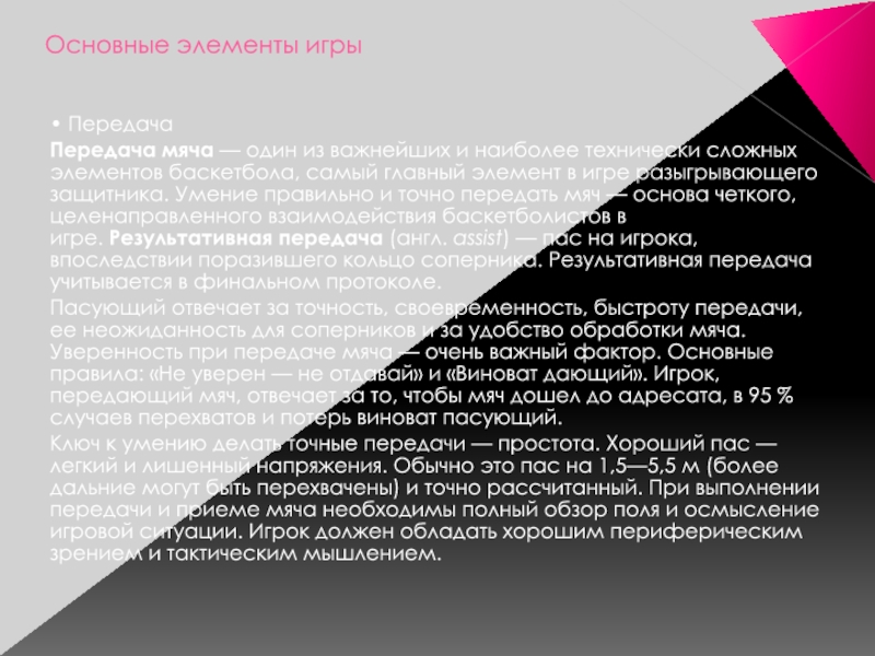 сложных элементов баскетбола, самый главный элемент в игре разыгрывающего защитника. Умение правильно и точно передать мяч — основа четкого, целенаправленного взаимодействия баскетболистов в игре. Результативная передача (англ. assist) — пас на игрока, впоследствии поразившего кольцо соперника. Результативная передача учитывается в финальном протоколе.