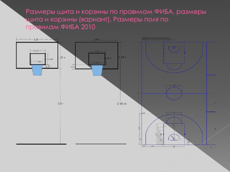 Слайд 6Размеры щита и корзины по правилам ФИБА, размеры щита и корзины (вариант),