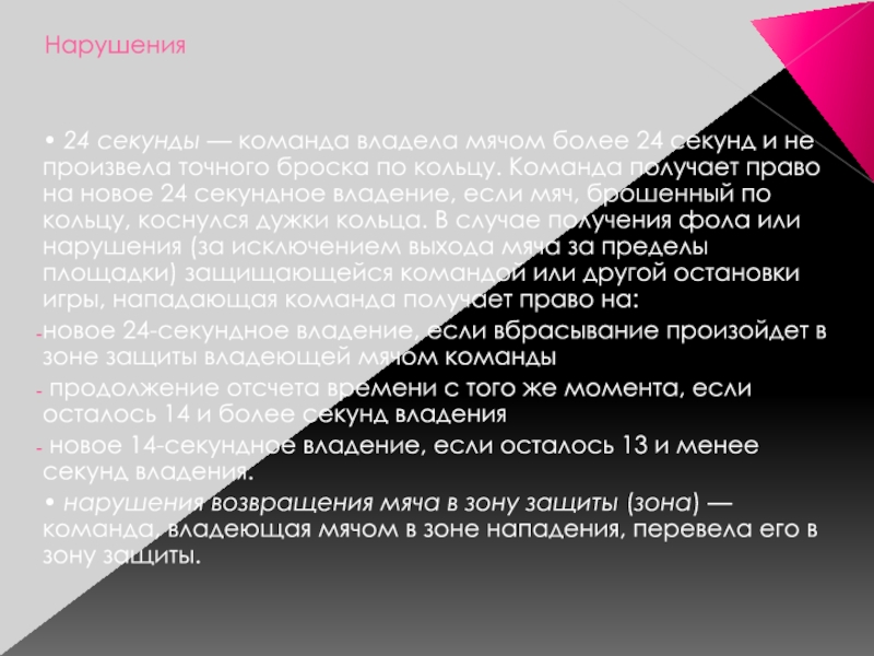 произвела точного броска по кольцу. Команда получает право на новое 24 секундное владение, если мяч, брошенный по кольцу, коснулся дужки кольца. В случае получения фола или нарушения (за исключением выхода мяча за пределы площадки) защищающейся командой или другой остановки игры, нападающая команда получает право на: