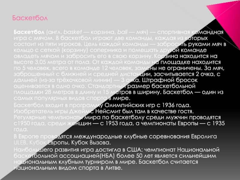Баскетбол (англ. basket — корзина, ball — мяч) — спортивная командная игра с мячом. В баскетбол играют две