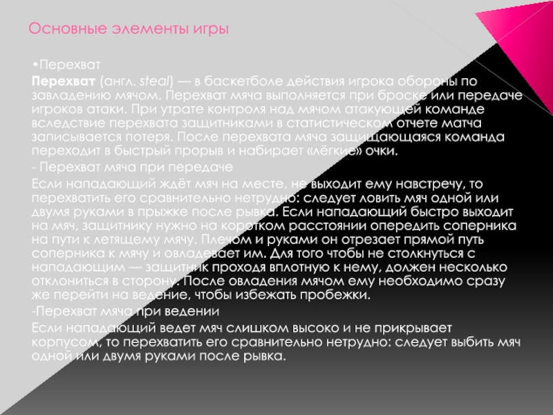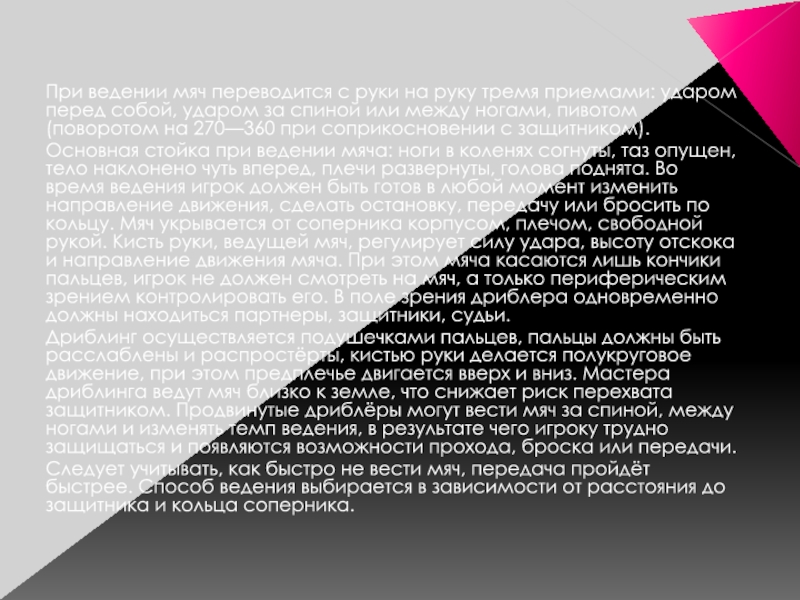 Следует учитывать, как быстро не вести мяч, передача пройдёт быстрее. Способ ведения выбирается в зависимости от расстояния до защитника и кольца соперника.