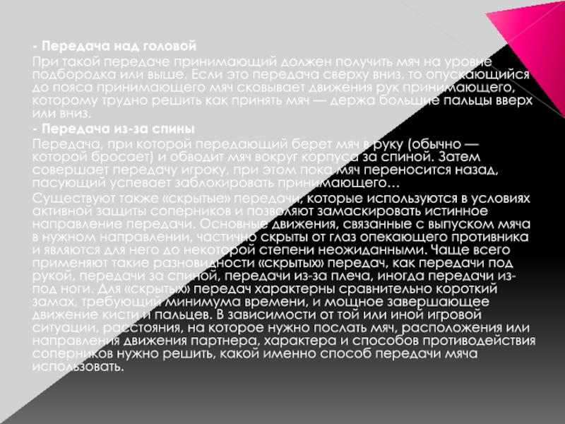 Существуют также «скрытые» передачи, которые используются в условиях активной защиты соперников и позволяют замаскировать истинное направление передачи. Основные движения, связанные с выпуском мяча в нужном направлении, частично скрыты от глаз опекающего противника и являются для него до некоторой степени неожиданными. Чаще всего применяют такие разновидности «скрытых» передач, как передачи под рукой, передачи за спиной, передачи из-за плеча, иногда передачи из-под ноги. Для «скрытых» передач характерны сравнительно короткий замах, требующий минимума времени, и мощное завершающее движение кисти и пальцев. В зависимости от той или иной игровой ситуации, расстояния, на которое нужно послать мяч, расположения или направления движения партнера, характера и способов противодействия соперников нужно решить, какой именно способ передачи мяча использовать.